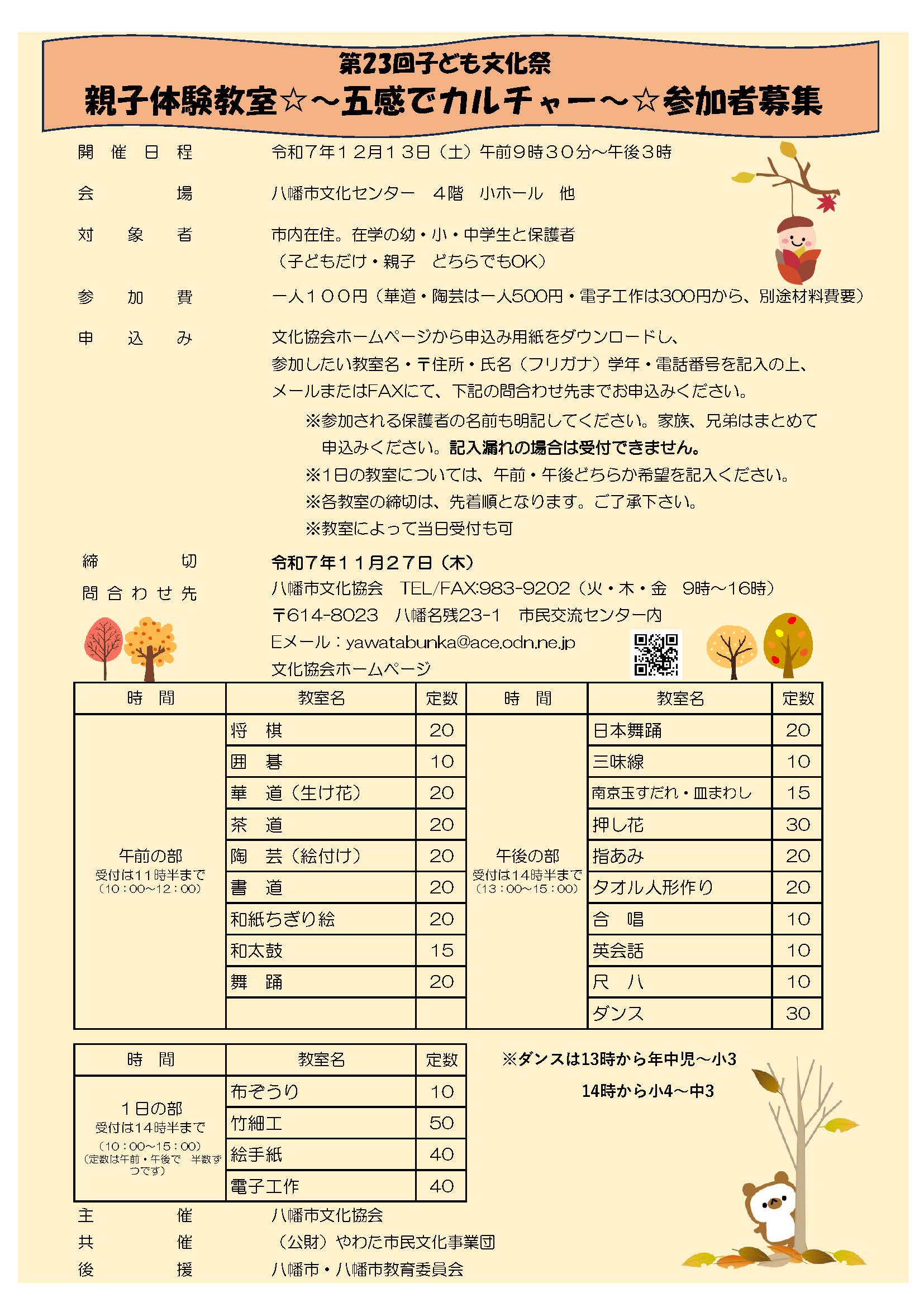 | 問合わせ・申込先 | 八幡市文化協会 TEL/FAX:075-983-9202(火・木・金 9時~16時) 〒614-8023 八幡名残23-1 市民交流センター内 Eメール:yawatabunka@ace.odn.ne.jp |